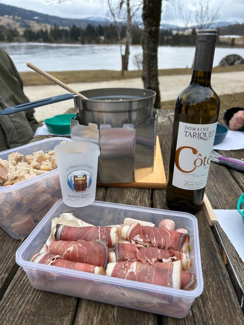 Super fondue au comté en mode pique nique dans la neige au milieu des sapins et seuls,